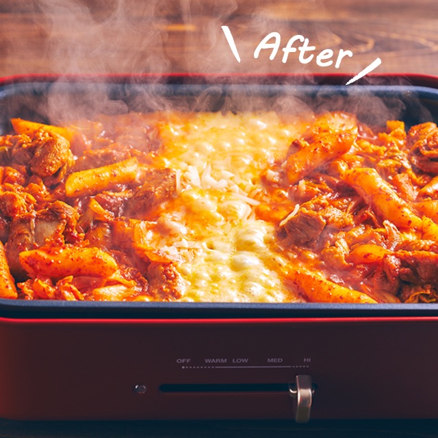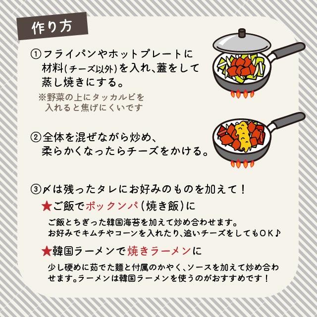 味付鶏肉(鶏肉、コチュジャン、その他)(国内製造)、トッポギ、ミックスチーズ、キャベツ、玉ねぎ/pH調整剤、調味料(アミノ酸等)、酸味料、香料、(一部に小麦・乳成分・牛肉・ごま・大豆・鶏肉を含む)