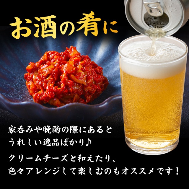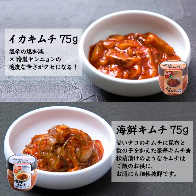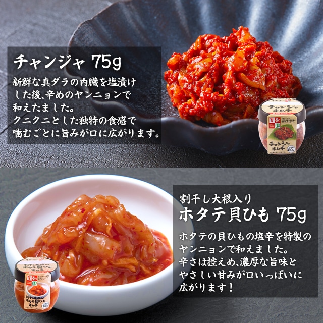 チャンジャ、ホタテ貝ひもキムチ、イカキムチ、海鮮キムチ。