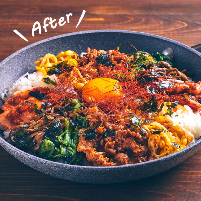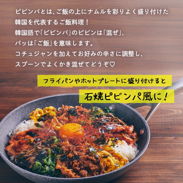 フライパンに盛り付けて石焼きピビンパ風にしても!※セットに含まれている韓国海苔は写真のものと変更になる場合がございます。