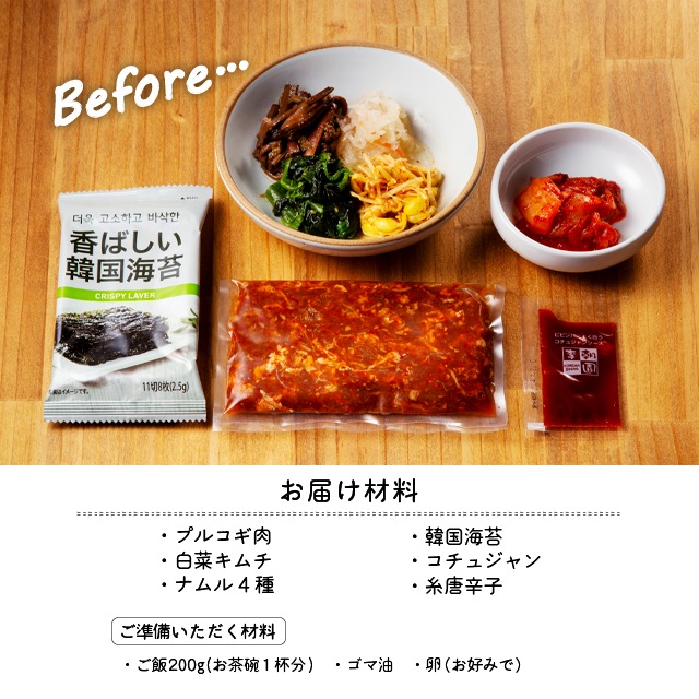 牛味付焼肉(牛肉(アメリカ産、オーストラリア産))、白菜キムチ、もやしナムル、ぜんまいナムル、ほうれん草ナムル、大根ナマス、コチュジャン、味付け海苔(別添)/調味料(アミノ酸等)、pH調整剤、酒精、甘味料(ステビア)、香料、酸味料、酸化防止剤(ビタミンC)、増粘剤