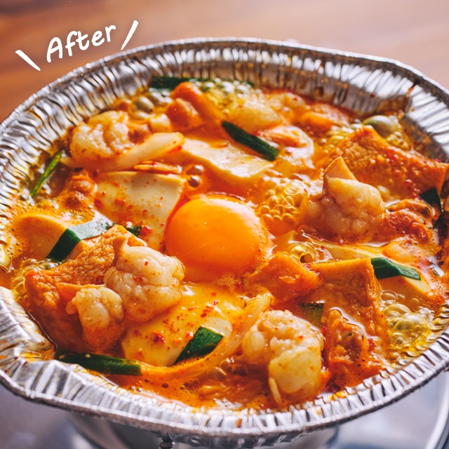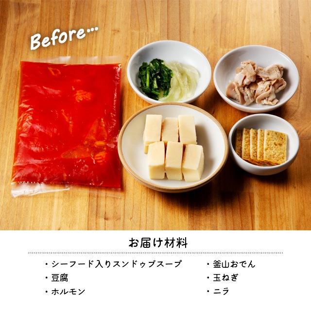 スンドゥブスープ(シーフードミックス、白だし、その他)(国内製造)、冷凍豆腐、牛小腸(国産)、玉ネギ、韓国おでん、ニラ/安定剤(加工澱粉)、凝固剤(塩化Mg)、調味料(アミノ酸等)、甘味料(キシロース)、アルコール、乳化剤、香辛料抽出物、香料、酸味料、保存料(ソルビン酸K)、酵素、(一部にえび・小麦・乳成分・いか・牛肉・ごま・大豆・りんご・魚醤(魚介類)を含む)