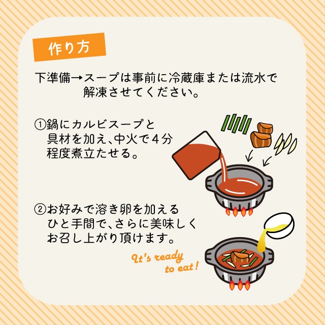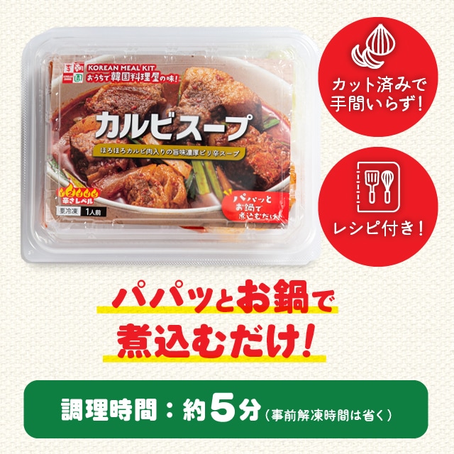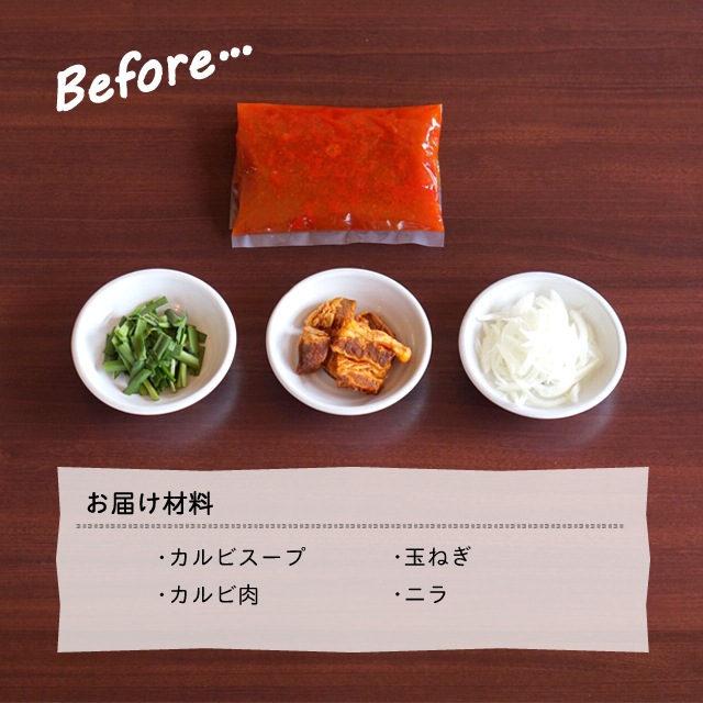 カルビスープ(牛肉、醤油、その他)、味付牛肉、玉ねぎ、ニラ/調味料(アミノ酸等)、香辛料抽出物、香料、酸味料(一部にえび・小麦・乳成分・いか・牛肉・ごま・大豆を含む)