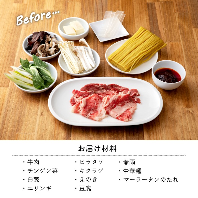 中華めん(小麦粉、卵たん白、食塩)(国内製造)、マーラータンスープ(麻辣火鍋の素、チャンポンスープ)、牛肉、豆腐(丸大豆、澱粉)、エノキ、白葱、チンゲン菜、エリンギ、ヒラタケ、春雨、キクラゲ/アルコール、調味料(アミノ酸等)、ソルビトール、かんすい、安定剤(加工でん粉)、凝固剤(塩化マグネシウム)、増粘剤(加工でん粉、キサンタンガム)、着色料(クチナシ)、甘味料(カンゾウ)、甘味料(アセスルファムK)、(一部に小麦・卵・牛肉・ごま・大豆・鶏肉・豚肉・魚醤(魚介類)を含む)