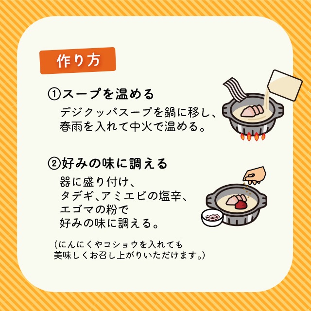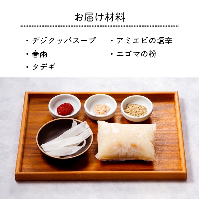 デジクッパ(ポークエキス、蒸し豚(豚肉、食塩、ニンニク、韓国味噌、ネギ)、豚頭エキス(豚頭骨、豚頭エキス)、豚肉、ニンニク、食塩、コショウ)(国内製造)、春雨、調味料(唐辛子、オキアミペースト(オキアミ、食塩)、ニンニク、みりん風調味料)、エゴマパウダー、アミの塩辛/pH調整剤、調味料(アミノ酸等)、酸化防止剤(V.E)、安定剤(キサンタン)、酒精、(一部にえび・かに・小麦・大豆・豚肉・魚介類を含む)