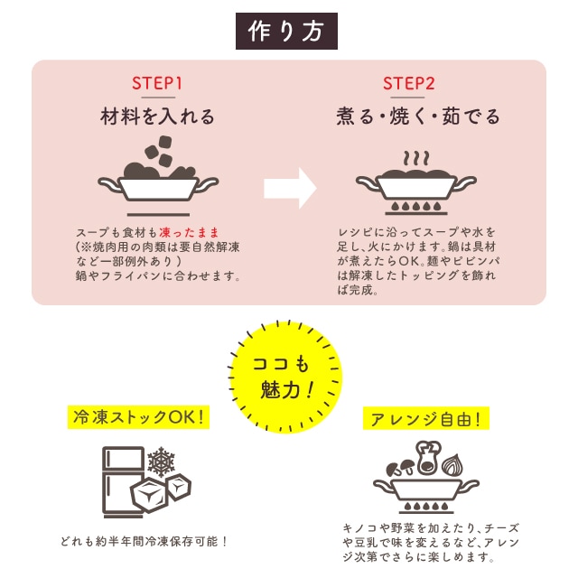 ミールセットはカット済み・下処理済みの材料やタレをセットにしてお届けしますので、 2ステップの簡単調理でお店の味をお楽しみいただけます!